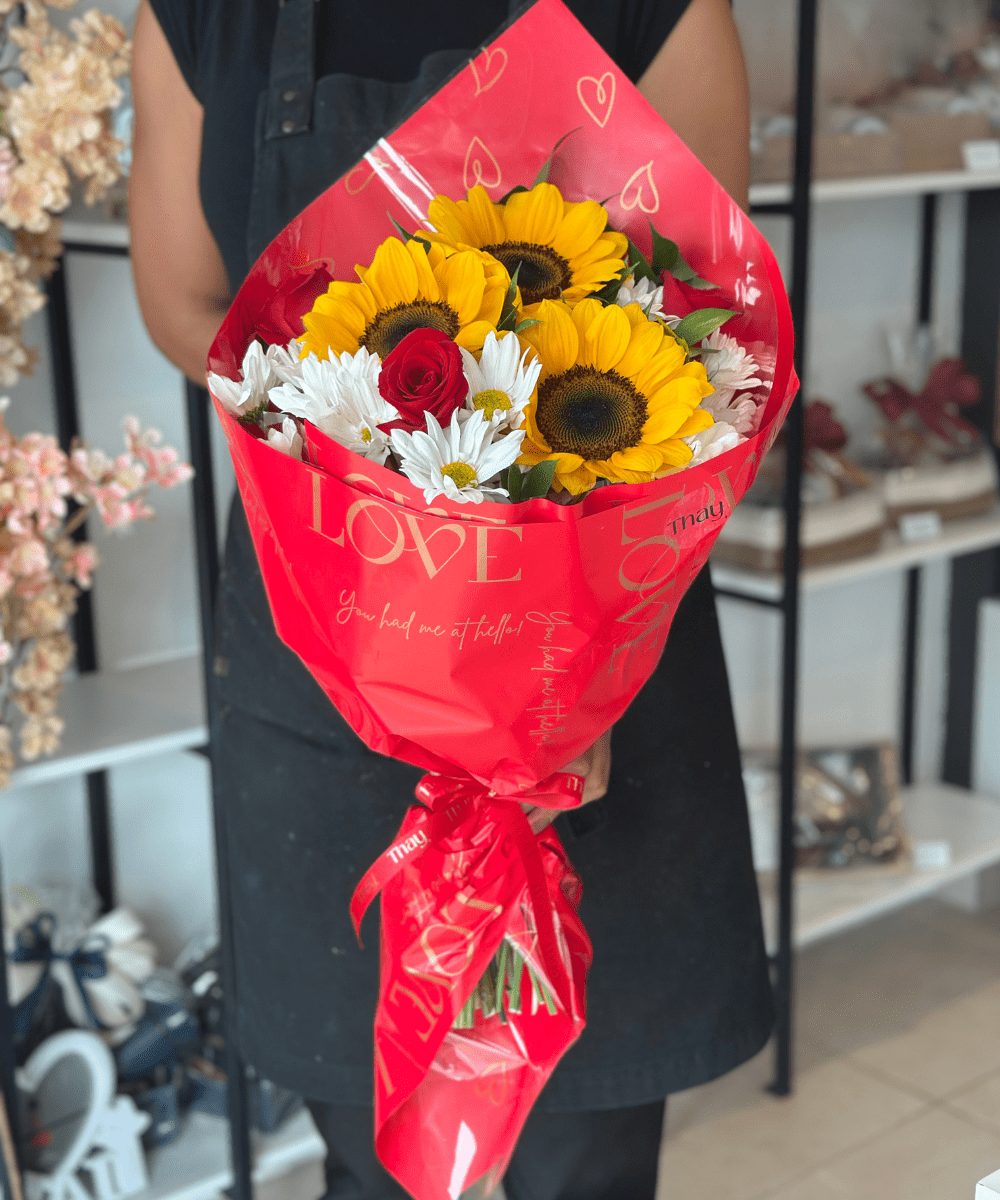 O Buquê de Girassóis com Rosas Vermelhas une a energia vibrante dos 3 girassóis com o romantismo das 3 rosas vermelhas, complementados por margaridas brancas e folhagens naturais.